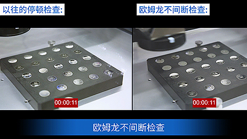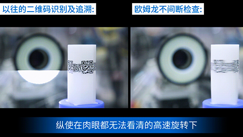 欧姆龙的不间断高速检查技术,有效解决了检查停顿的课题,提高生产性,画像检查节拍时间缩短70%。另一方面,该技术可以在保证拍摄速度的同时,准确拍摄到高速旋转的二维码并识别。