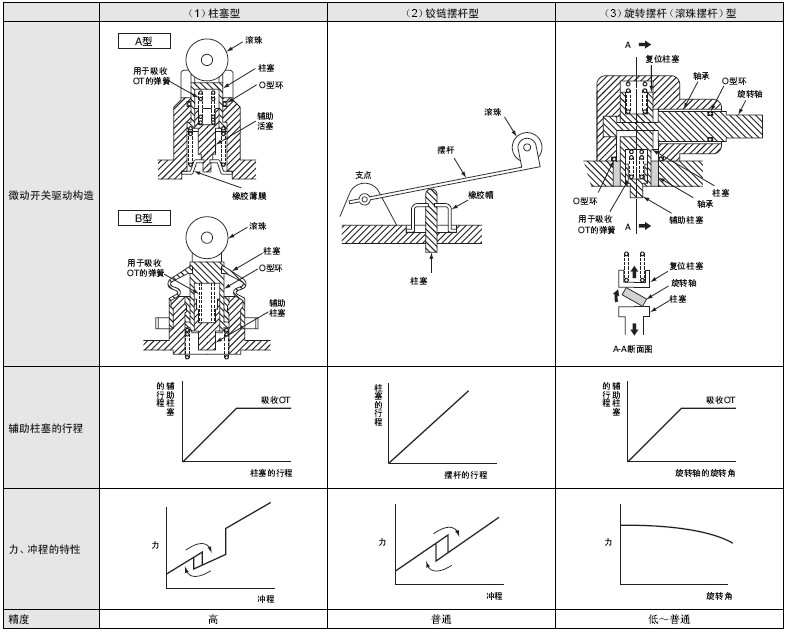 ■限位开关的概念限位开关,指为保护内置微动开关免受外力、水、油、气体和尘埃等的损害,而组装在外壳内的开关,尤其适用于对机械强度和环境适应 性有特殊要求的地方。 ■内置微动开关驱动机构对于限位开关来说,微动开关的驱动机构是与密封性能和动作特性直接相关的重要部分。其构造分为三类,如下表所示。 (1)活塞型 (2)铰链摆杆型 (3)旋转摆杆型