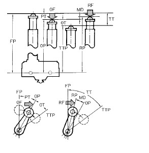 注. y为相对于全行程(TT)的比例,表示挡块正确的按下量应为TT的50~80%(50~70%)。 ●柱塞型驱动杆 在挡块越过驱动杆的情况下, 前进方向和后退方向的形状可以相同,但必须避免驱动杆和挡块快速分离的形状。