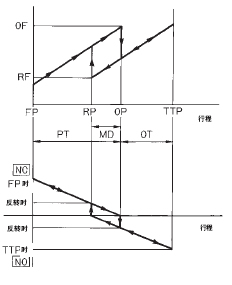 利用这一动作原理, 微动开关以开关固有的切换速度(离开速度) 切换接点, 而与按住拉力弹簧时产生外力的速度无关。F0=0时的位置称为动作位置,与拉力弹簧的一部分通过死点的位置基