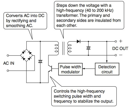 它的特长是小型、重量轻、高效率,几乎作为所有电子机器的电源被广泛使用。 |