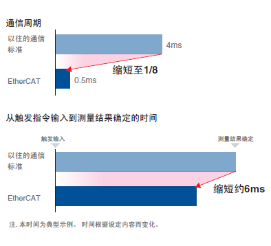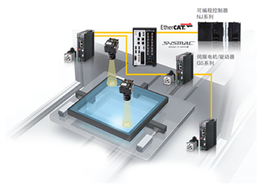 EtherCAT是最适合工业控制的高速开放网络。利用EtherCAT连接可编程控制器NJ系列、 控制运动的伺服马达/驱动G5系列,能实现比一般的通信规格更高速地从工件的位置测量到启动轴为止进行控制。