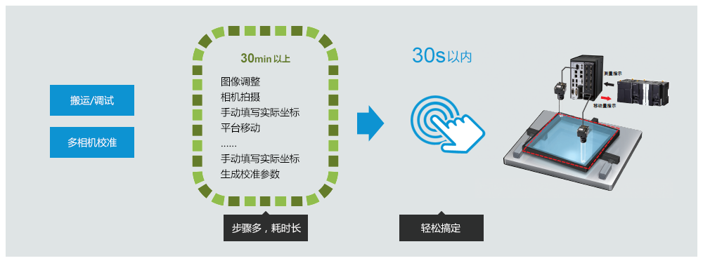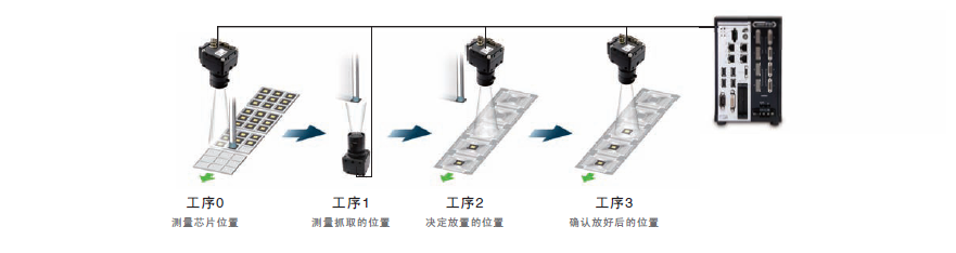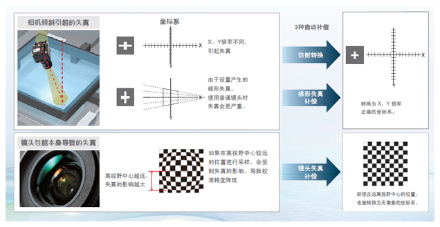 根据对应的位置信息,计算从测量位置到基准位置的各轴移动量。此方式最适合类似电子基板的贴合等,如偏离一定距离将导致导通不良,必须将所有点的距离控制在一定范围内的运用。
