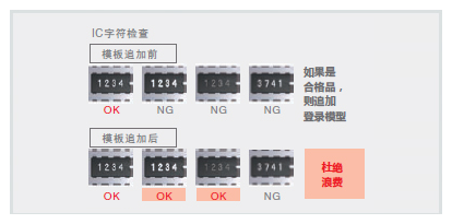 在灵活搜索处理中,通过将多个合格品作为模板登录好,这样无论对象物的印刷质量或形状变化如何,都可实现准确搜索。只将明显的异类作为不良品检测出,切实降低了浪费。