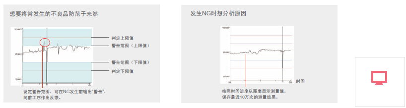 可将测量值的趋势图表化,在不良发生之前发出“警告”。可将NG防范于未然,有助于向前一个工序作出反馈和分析发生NG的原因。