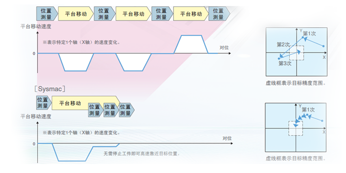 欧姆龙建议采用排除工件停止时间(造成处理时间增加的主要原因)的控制方法。利用可实现高速、高精度控制的自动化平台Sysmac,可连续检测工件位置,逐次更新距离目标位置的移动距离,无需停止工件即可高速靠近目标位置。