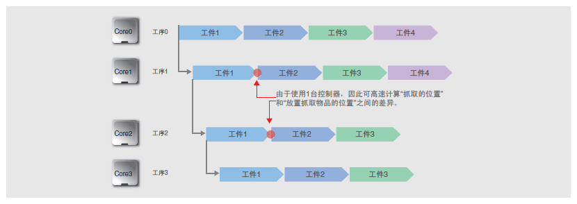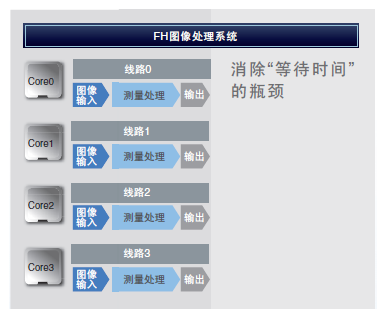 利用四核独立并行处理,即使需要根据前工序的测量结果控制后工序,也可高速处理各工序而无需等待。可在同一控制器中对四个工序的测量结果进行演算,因此“工序间的联动”无需另外的程序即可实现。