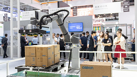 “人机的高度协作”展区内,展示了人机协作的智能化单元生产线(CLCS)、人机协作码垛等。人机协作的智能化单元生产线是一套融合了AI、IoT、移动操纵机器人应用(MoMA)、协作机器人等欧姆龙先进技术,基于大数据分析,实际运用在欧姆龙自社工厂的近未来生产管理系统。人机协作码垛减少生产现场工伤的发生及改善劳动环境,提高生产效率,实现了兼顾安全性和生产效率且无需改造现场的装卸货作业自动化。通过人机协作,让机器随机应变地替代人类完成单纯作业、进行支援和协助,在将人类从超负荷身心重压下解放出来的同时,提高劳动生产效率,实现基于“人机无缝协作”的制造业革新。