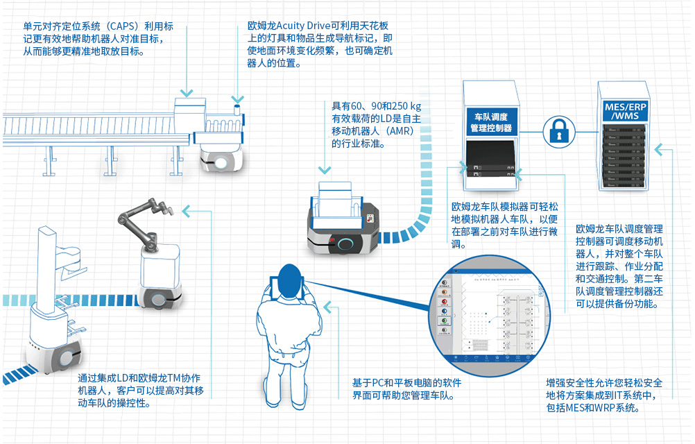欧姆龙车队调度管理控制器可与MES和WMS轻松集成,使机器人立即投入使用。