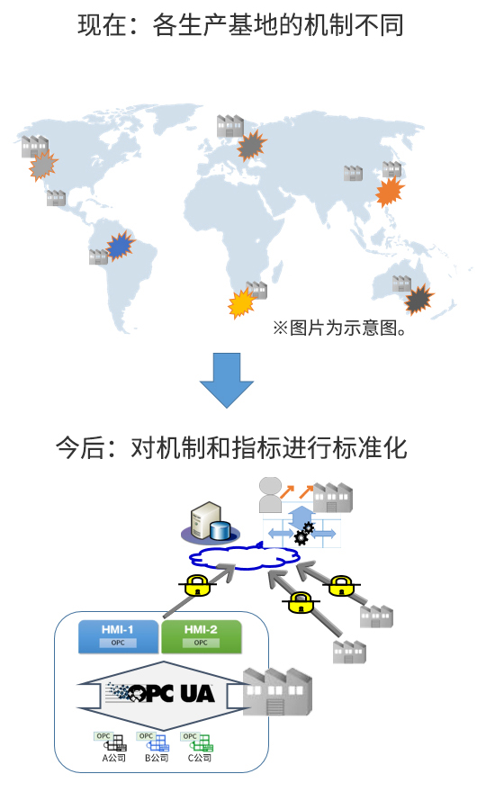 如今存在着世界各地的生产基地引进的信息化机制各异的问题。通过M&A等扩大事业是问题的成因之一。为了促进全公司的信息利用并提高生产效率,需要解决对指标(KPI)和机制进行标准化这一课题,作为可以在全球范围内实现标准化,而且前景光明的基础架构,OPC UA得到了越来越多的采用。