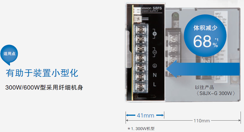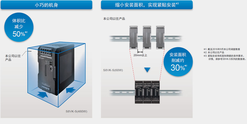利用高效率、低损耗技术,实现小型化。利用欧姆龙的热控制技术,实现紧贴安装。缩小安装面积,为控制柜的小型化作出贡献。