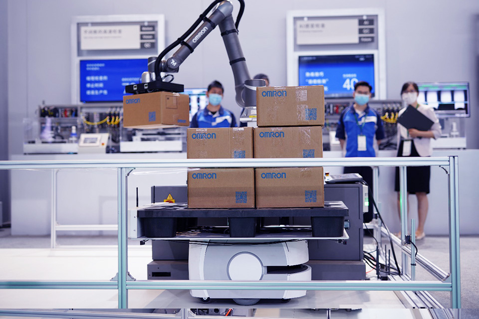 「人机协作的智能化单元生产线」是一套融合了AI、IoT、移动操纵机器人(MoMA)、协作机器人等欧姆龙独有的先进技术,基于大数据分析,实际运用在欧姆龙自社工厂的近未来生产管理系统。通过欧姆龙独创的自动化和智能化,最大限度地挖掘人的潜力,实现高生产性·柔性和高品质、强应急能力的只能化单元生产线。