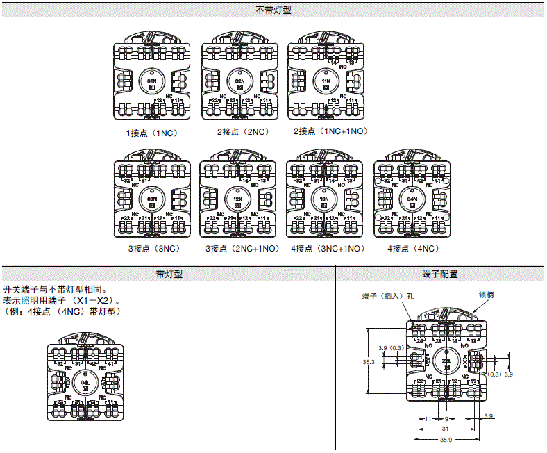 *1. 亮灯部位的同极端子之间未配备LED。不适用于带灯型100~200V规格的亮灯部位。