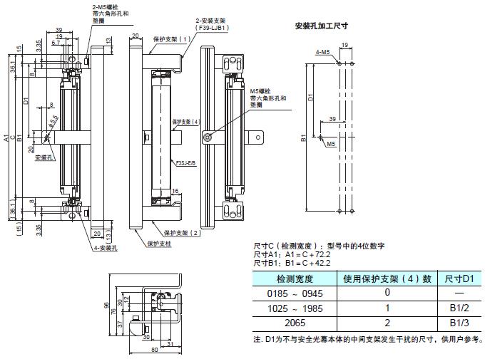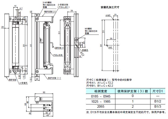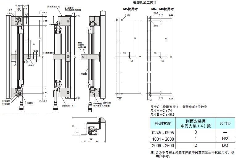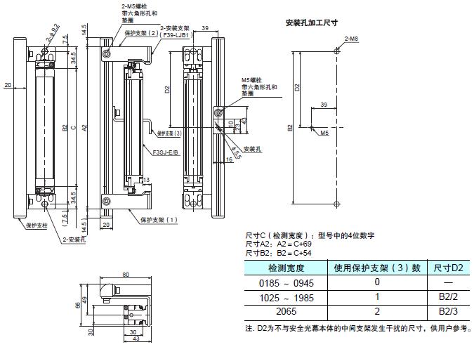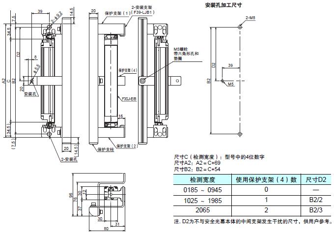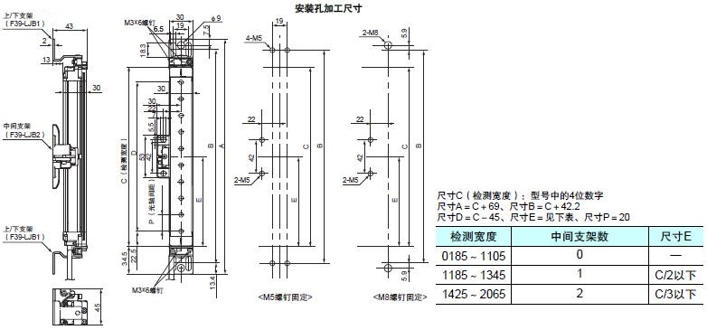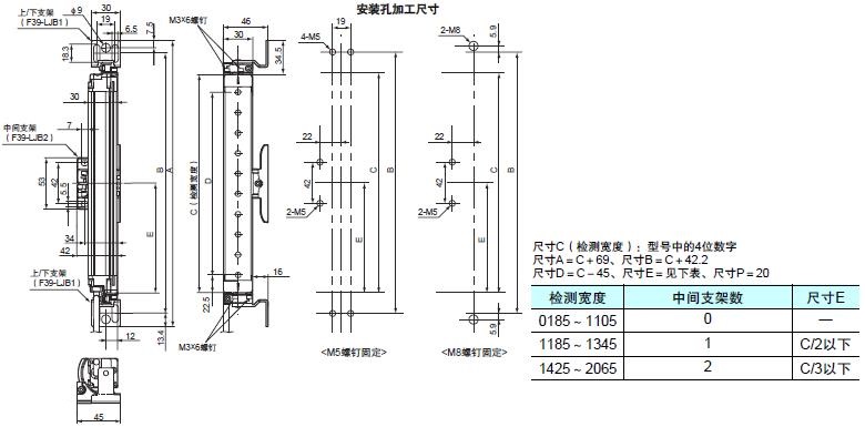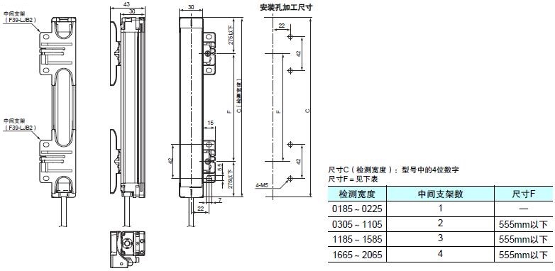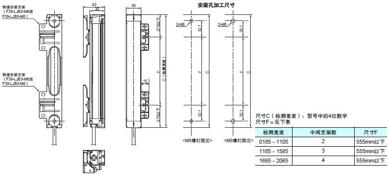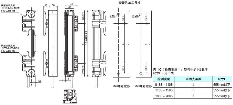 注. 由于F39-LJ8无法与中间支架一起安装,因此请保持检测宽度在600mm以下。