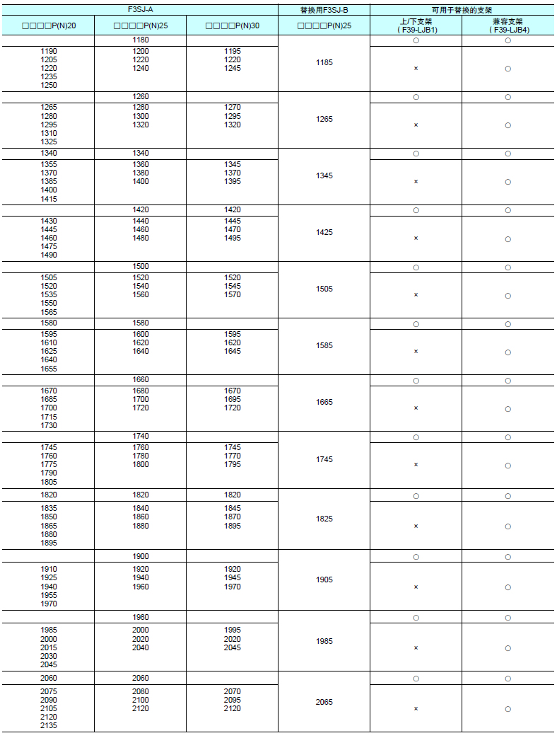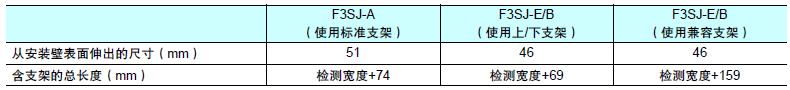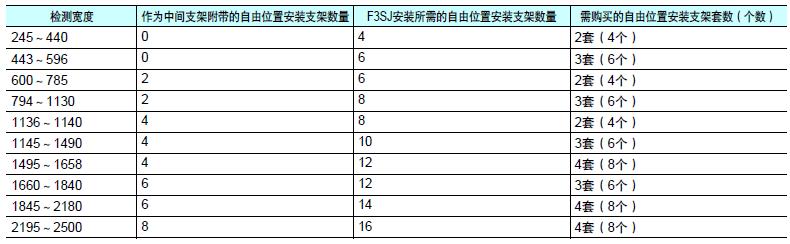 F3SJ-B□□□□P25-02TS所需中间支架(快速安装支架)数与F3SJ-E/B系列其它型号不同。下表列出与检测宽度相对应的所需数量。