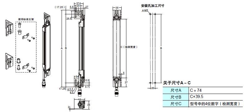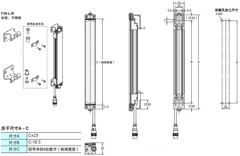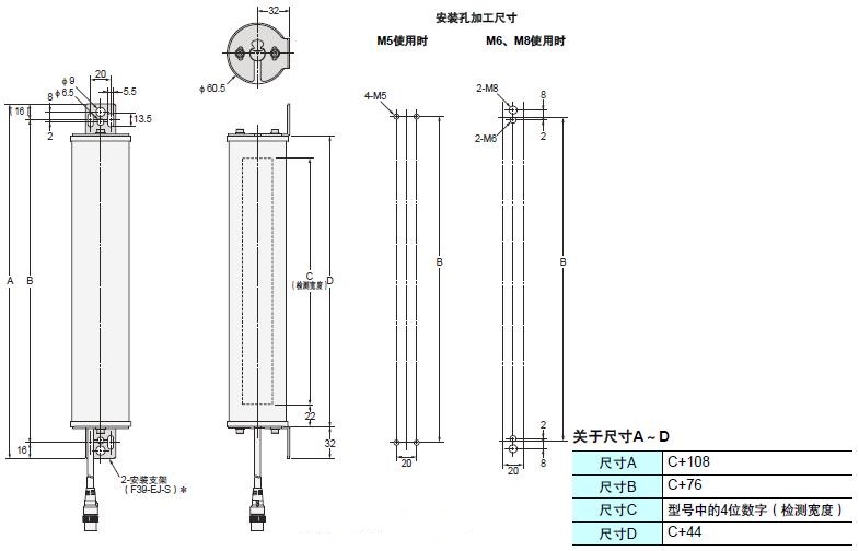 注. 有关安装支架尺寸的信息,请参阅《F3SJ-B □□□□ P25-02TS 用户手册》(SCHG-CN5-736)。所用支架与F3SJ-E/B系列其它型号相同。