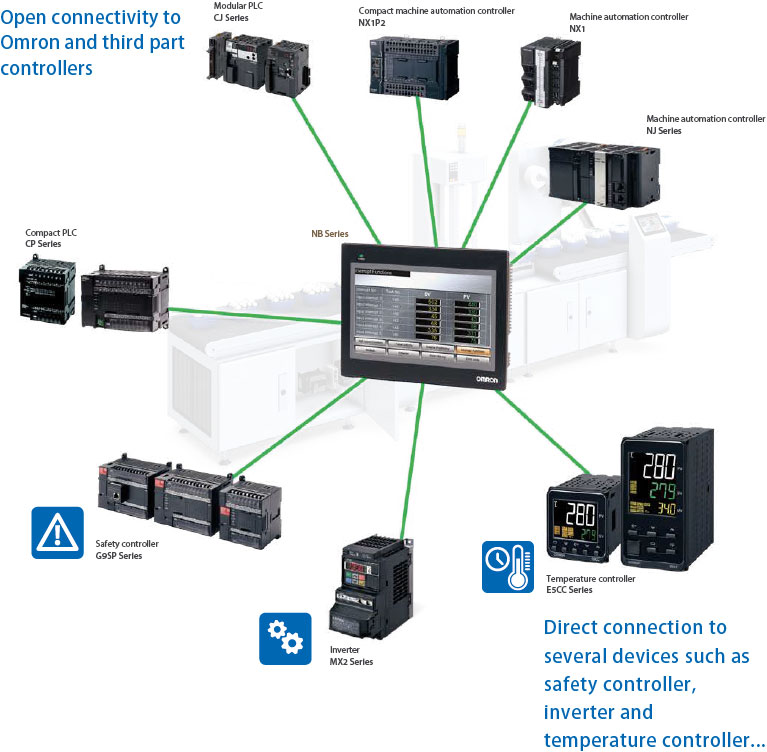 得益于“宏”的出色功能,NB系列的功能得以进一步增强,不仅可以执行计算、对比或迭代以及数学运算,还可在NB屏幕上绘制图形和图案以及向本地存储器/相连设备的存储器中写入值或从本地存储器/相连设备的存储器中读取值。种类丰富的NB系列产品功能丰富,可应用于包装、食品、塑机、纺织等行业中的简易式加盖机、封盖机/旋盖机、直列式灌装机、直列式封装机/直列式贴标机等众多机器上。此外,用户还可随时从欧姆龙网站上免费下载最新版的NB-Designer软件。