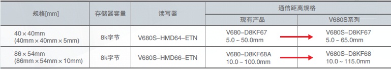 V680S系列的RF标签与V680S系列读写器组合成为理想设计。通信距离规格值比现有同等品最大增加30%。可更灵活地进行设备设计。