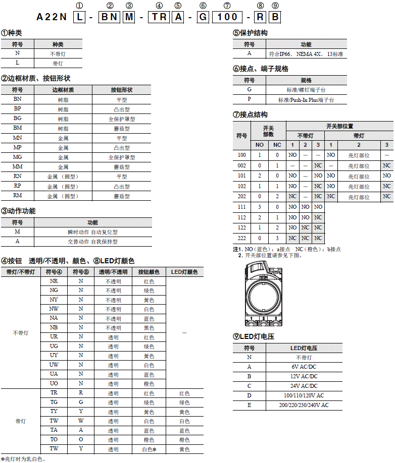 | 亮灯时 | 红色 | 绿色 | 黄色 | 白色 | 蓝色 | 橙色 | 乳白色* | ||