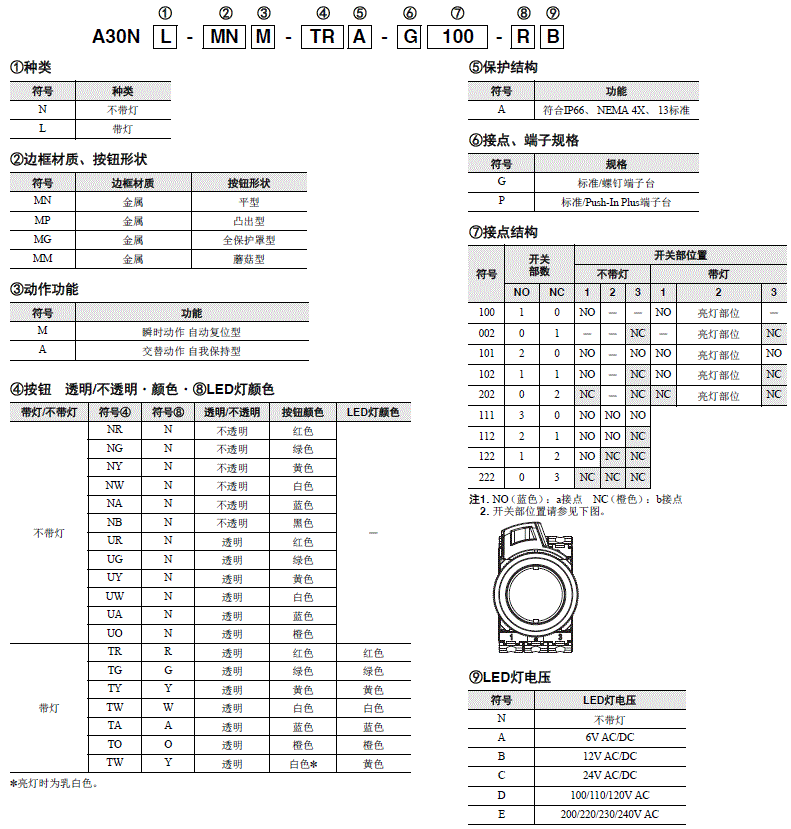 | 不带灯 | 不透明 | 红色 | A30NZ-MGM-NRA | A30NZ-MGA-NRA | A30NZ-MMM-NRA | A30NZ-MMA-NRA |