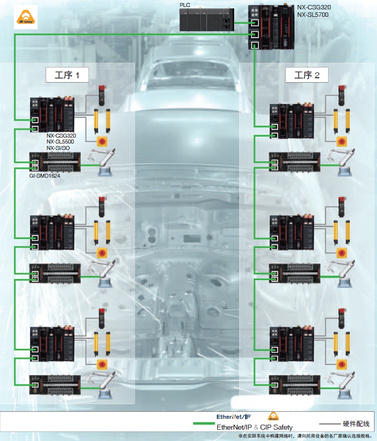 整个系统由支持EtherNet/IP、CIP Safety的多台设备和装置构成。