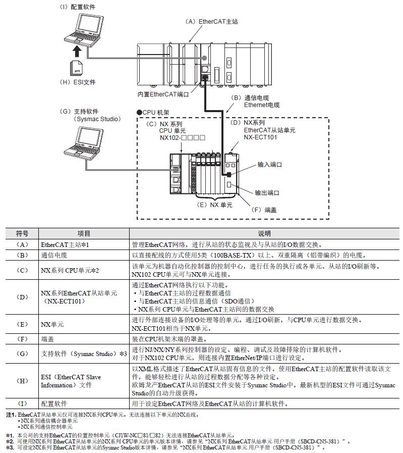 NX系列EtherCAT从站单元的系统构成示例如下。 使用NX系列CPU单元中的NX系列NX102 CPU单元时的示例。 使用NX102 CPU单元以外的NX系列CPU单元时,请参见所连接的CPU单元的用户手册。