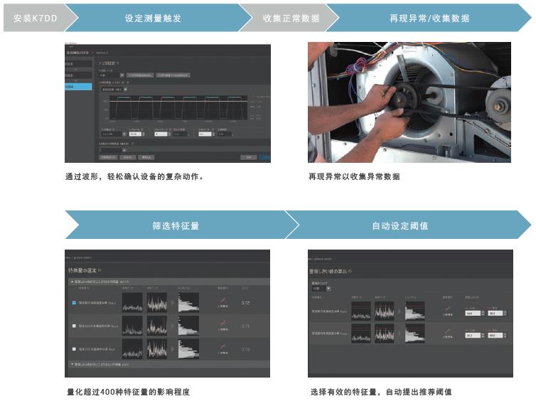 以50ms为周期进行运算处理,计算出超过400种特征量,可有效监视电机的多种故障模式。另一方面,处理这些数据需要非常高端的数据分析技能。K7DD支持通过这些分析快速启动设备的计划性维保。