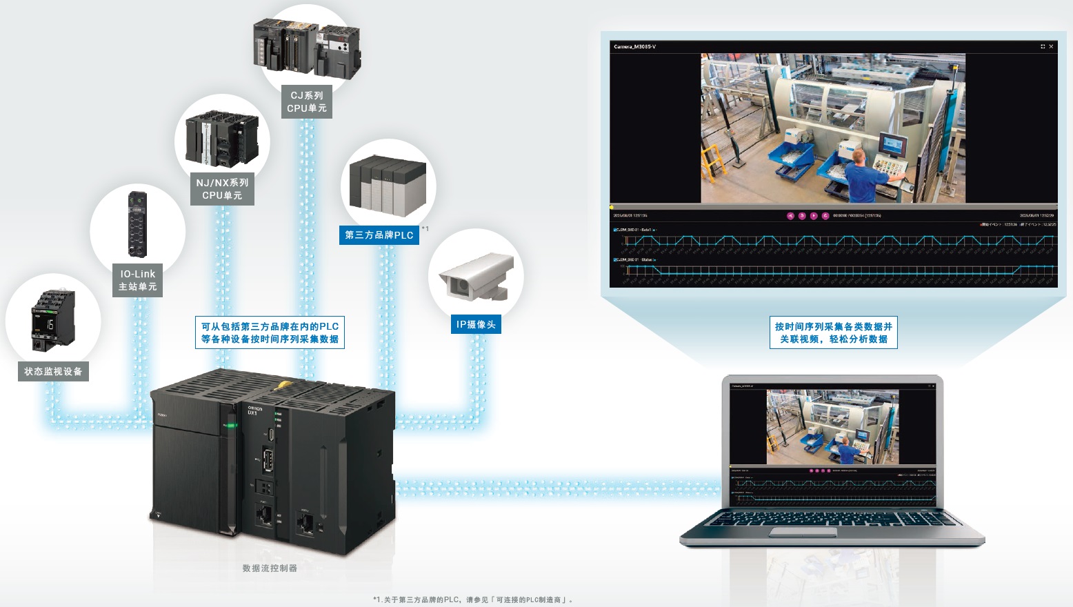 只需连接指定设备*1,并选择数据流控制器中预装的功能包,就能以最少的必要设定自动采集并可视化数据,轻松无忧地开始数据活用。