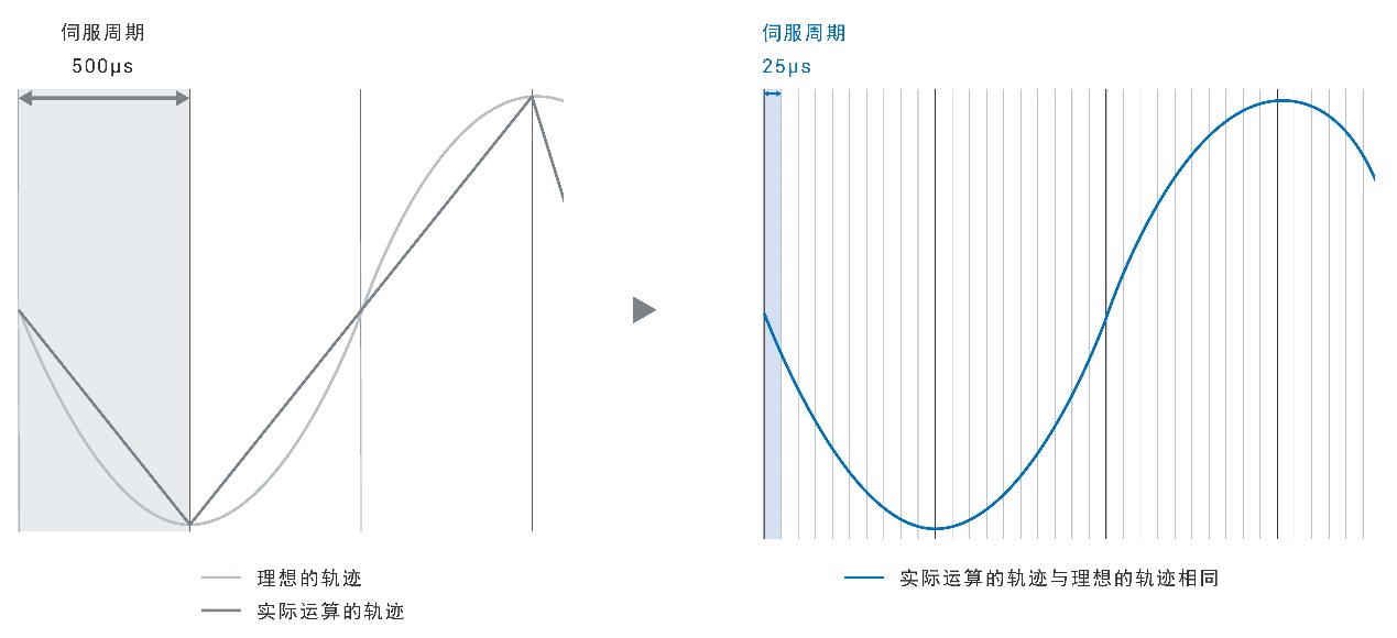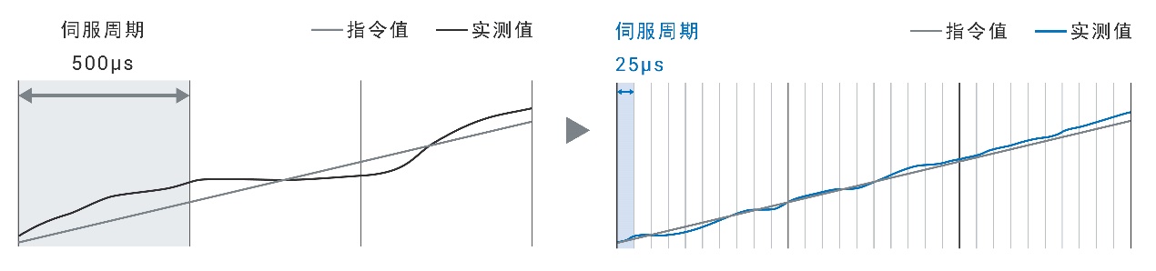 只要存在高精度的指令,即可通过追踪指令,实现高精度的运动控制。通过高速接收并补偿反馈值,实现更接近指令值的轨迹控制。