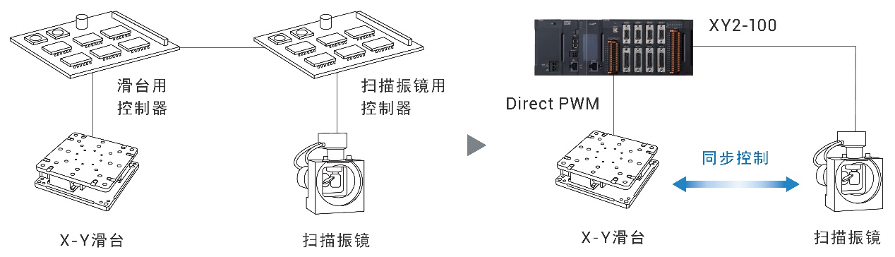 输入接口支持A/B相信号、正弦波信号、串行数据I/F,而控制指令接口也支持模拟指令(DAC)、基于Direct PWM*2的轴控制。该系统可连接高精度的标尺、精密的直线电机、高精度的扫描振镜等,能自由选择适合客户应用的设备构成。还能通过各执行器之间的高精度同步控制实现高精度的加工。