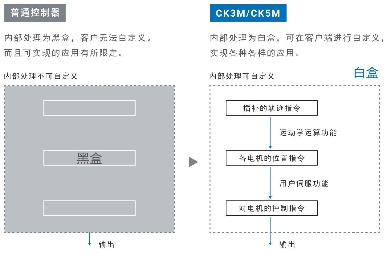 内部处理为白盒,可在客户端进行自定义加工数据坐标系和执行器机械坐标系的关系,轻松实现需要复杂执行器机构的应用,(例如:机器人机构和On the Fly激光加工等)。