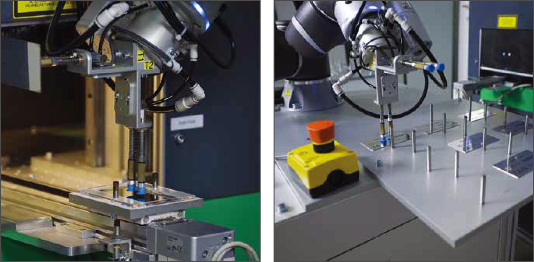 客户对协作机器人的主要需求是为激光打标机提供自动机械上下料。协作机器人会拾取需要打标的原材料,并将物品送入机械,待加工完成后再将其取出。如果进料站空了,协作机器人会向操作人员发出警报。由此,系统可以自行运行很长时间。