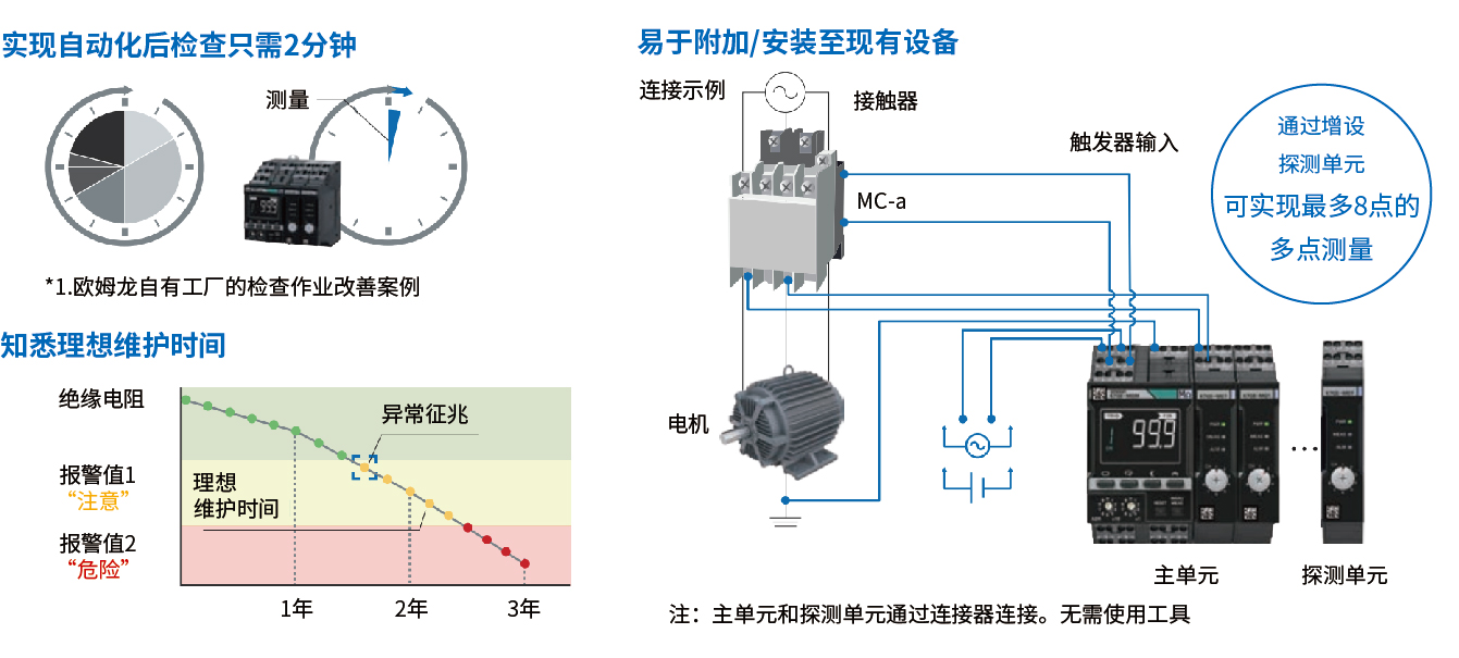 K7GE可以自动监测绝缘电阻值,主动掌握绝缘老化的趋势,无需进行高空点位巡检,减低作业人员的工伤风险。此外,K7GE能够通过触摸屏、PLC和通信转换器的网络连接,在办公室进行远程监视,无需前往生产现场,高效地完成自动监测。