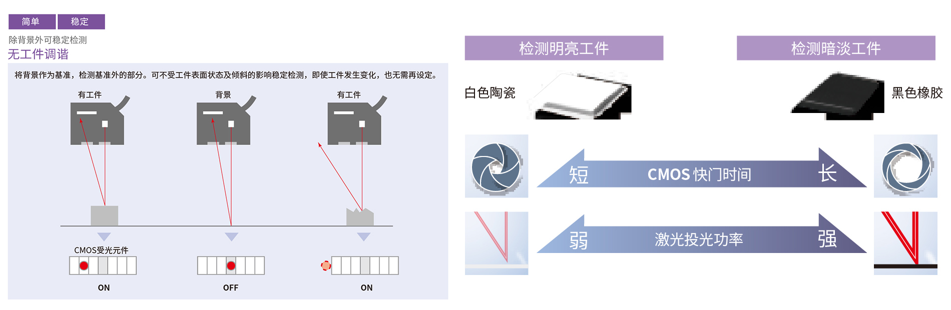 E3NC-S可以根据工件调整CMOS快门时间,还能调整投光功率,实现扩散光摄取量的理想化。即使工件颜色、材质、表面状态不同,也能实现稳定检测。