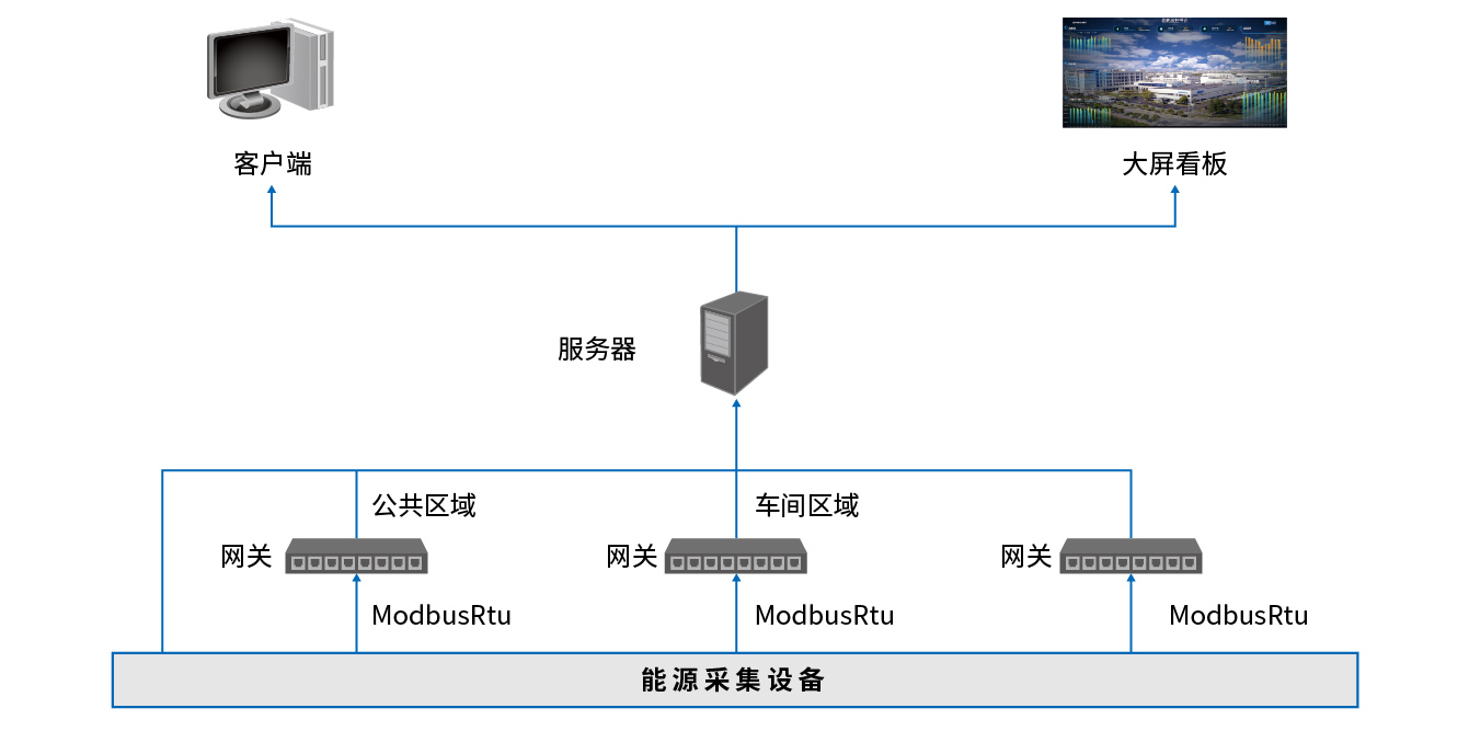 ■ 数据采集:采集厂区内200个左右仪表数据。 ■ 看板系统:对厂区的不同区间水电气能耗进行轮播展示。 ■ 查询、报警及报表导出功能:对厂区内能耗数据进行分类查询及数据报表导出。