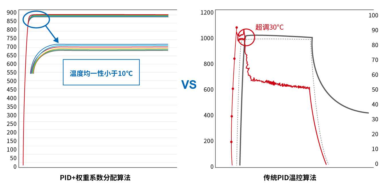 在传统PID控制的基础上,创新权重分配算法,实现高速同步升温控制。