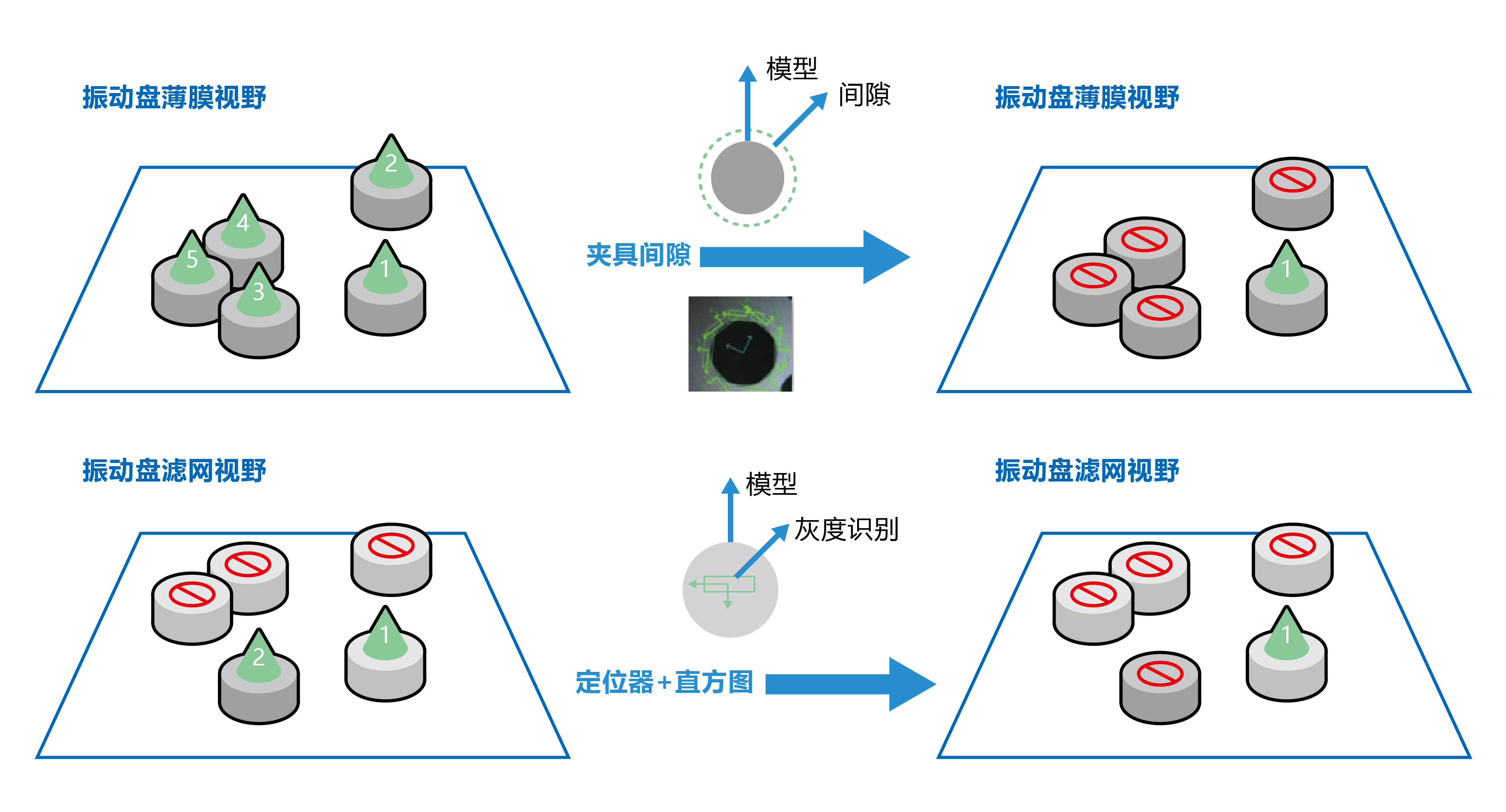 通过视觉工具“夹具间隙”实现振动盘内重叠薄膜的识别过滤,再通过“直方图”工具过滤重叠滤网,避免因抓取NG,导致最终的组装NG,严重影响产线节拍。