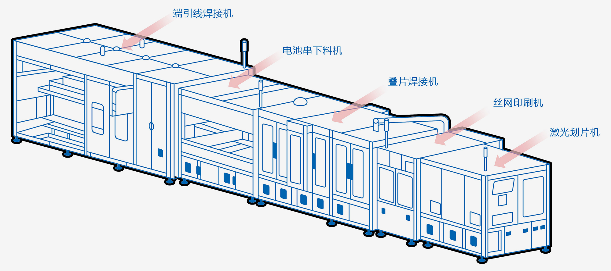 叠焊机主要用于全自动晶硅太阳电池组件中单晶、多晶电池片的叠焊,适用于小规格晶硅太阳电池片的串联焊接,电池片搬运采用SCARA机器人配合视觉进行精准定位,采用丝网印涂胶工艺进行焊接,提高电池转换效率,利用输送带加热加快电池片焊接。