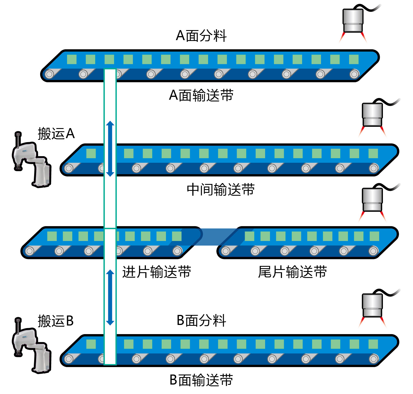 ④ A面、B面、中间、尾片输送带安装视觉进行物料位置检测、OK/NG检测。