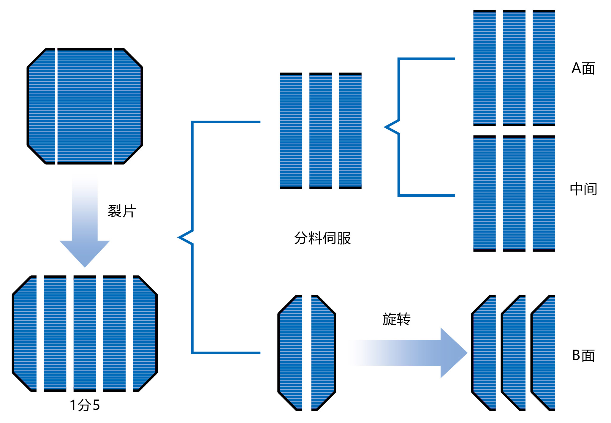 叠焊机作为太阳能电池行业的新型工艺,相比于拉焊机工艺,大大提高电能转换效率。采用叠片算法以后,将叠焊机的合格率提升10%,结合视觉定位叠片精度高达±0.05mm。