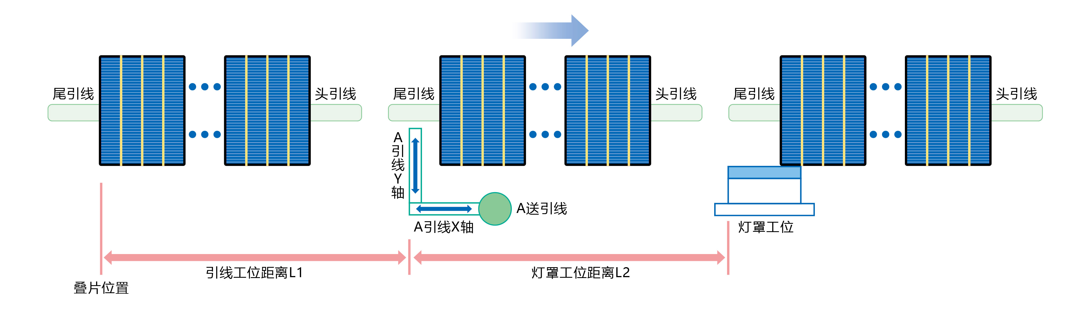 电池串首片、尾片需要增加引线,增加X,Y引线机构配合送引线伺服,对引线进行定长输送,通过灯罩进行焊接。