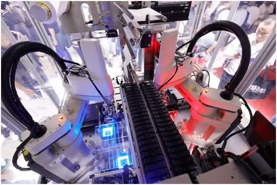 超高速视觉系统FH系列对位置数据进行采集,再通过NX1系列机械自动化控制器,自带的叠片算法,得出机器人的气爪叠片位置。机器人全部由拥有高负载、长臂展的欧姆龙SCARA组成,而伺服驱动全部采用欧姆龙1S系列,可实现对动作曲线的精准控制。