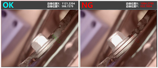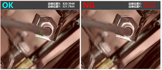 同样的,通过边缘位置计算,首先定义正确安装状态下的边缘位置X轴和Y轴的坐标点。之后的每一个也与此坐标值进行对比,一旦坐标值出现偏差则说明卡子并未安装到位,判断为NG。