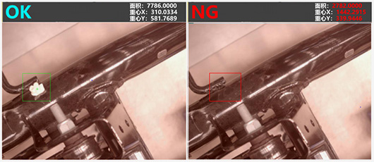 除了边缘位置计算之外,亦可通过观察颜色面积,例如图中的白色卡子,首先定义正确安装状态下白色面积的大小。之后的每一个,都观察并对比画像中白色所覆盖的面积值, 一旦出现偏差则说明卡子并未安装到位,判断为NG。