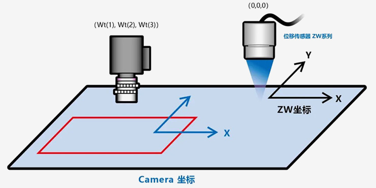 由于标定使用位移传感器 ZW系列(以下简称“ZW”)作为基准,所以标定完的结果是以ZW焦距位置为WCS原点的。要统一坐标系,就要统一相机焦距中心和ZW焦距之间的关系以及统一胶阀和ZW焦距之间的关系。