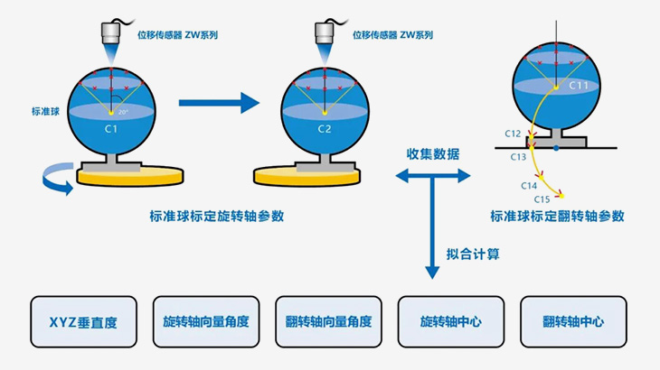 使用雷尼绍标准球,通过在平台不同姿态下搜索标准球最高点的数据和当前各轴位置来拟合并计算出平台的参数如垂直度、向量、原点中心。