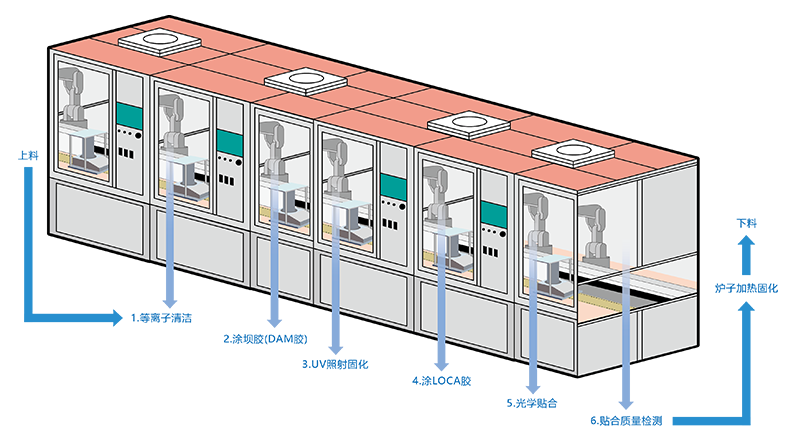 双联屏的贴合工艺主要由6台机器人完成,从上料开始,分别经过等离子清洁→涂坝胶(DAM胶)→UV照射固化→涂LOCA胶→光学贴合→贴合质量检测共6个步骤,最终由炉子加热固化并成型。