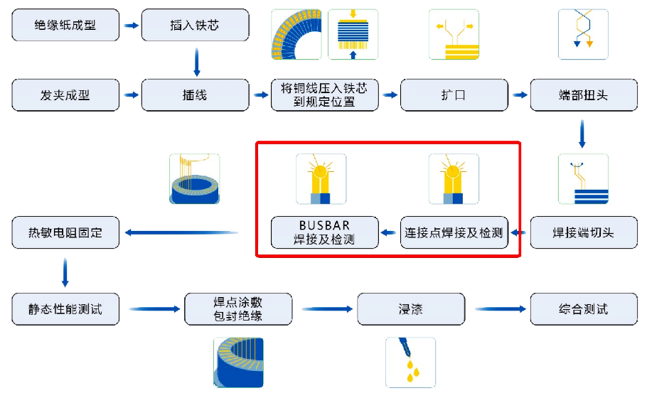 扁线电机,是定子绕组中采用扁铜线,先把绕组做成类似发卡一样的形状,穿进定子槽内,再在另外一端把发卡的端部焊接起来。在焊接完成后,为确认最终成型的品质,需通过大量人工,对焊点质量进行检查。
