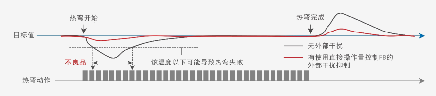 使用【过程控制技术】控制操作量,温度稳定后切换成PID控制,可减少如模具较低的温度等外部干扰引起的温度降低,尽快实现加热器温度的稳定。