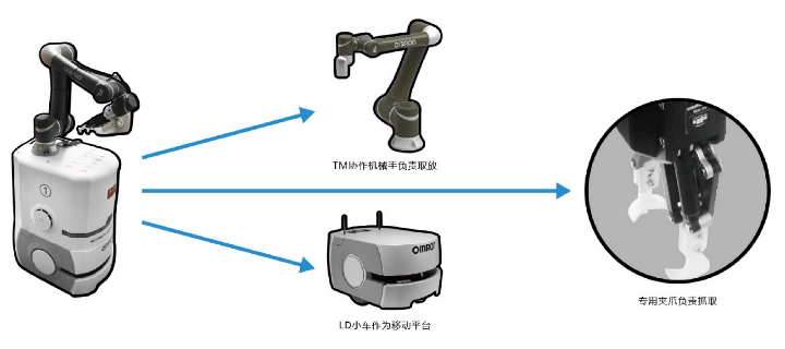 使用LD90小车作为移动平台,在LD小车上集成TM协作机械手,构成MOMA移动手臂解决方案,并安装3D打印成型专用夹爪,满足自动配石需求。
